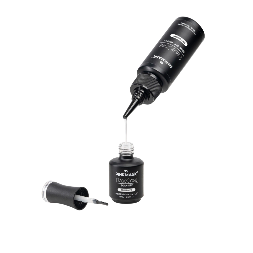 Envase para refill. Contiene 60 ml de Base Coat, con punta aplicadora para dosificar correctamente el producto dentro del envase de Base Coat de 15 ml.